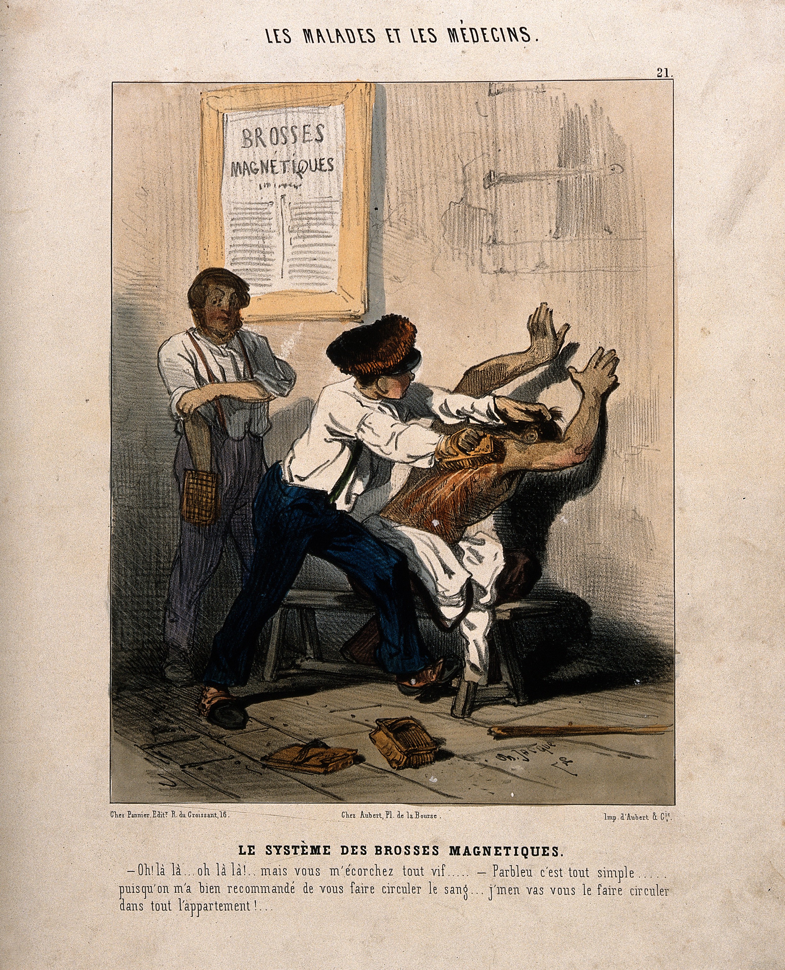 A man is violently rubbed with magnets. Coloured lithograph by C. Jacque, c. 1843.